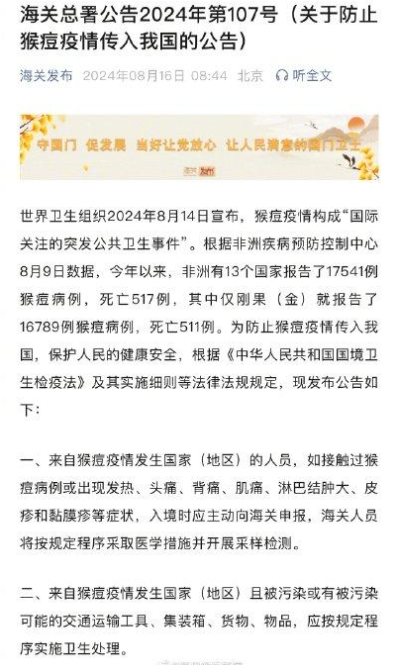 中国海关的预防措施:为防止猴痘疫情传入中国,中国海关总署发布了相关公告,决定在未来一段时间内对入境人员和货物进行Mpox病毒监测。