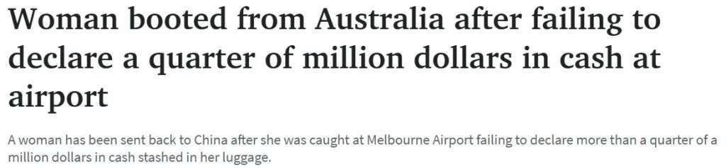 《先驱太阳报》报道称,该女子于上7月末抵达墨尔本机场时,没有如实申报行李中的大量澳元、美元及港币,最终被遣送回国。