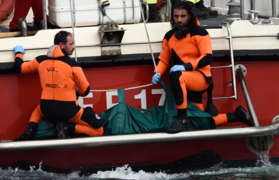 潜水员用绿色袋子将遇难者的尸体打捞上岸 Salvatore Cavalli/美联社照片