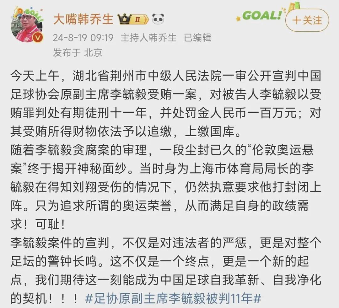 在李毓毅受贿案宣判后,前央视评论员韩乔生在社媒发文透露,尘封已久的“伦敦奥运悬案”也终于揭开了神秘面纱。