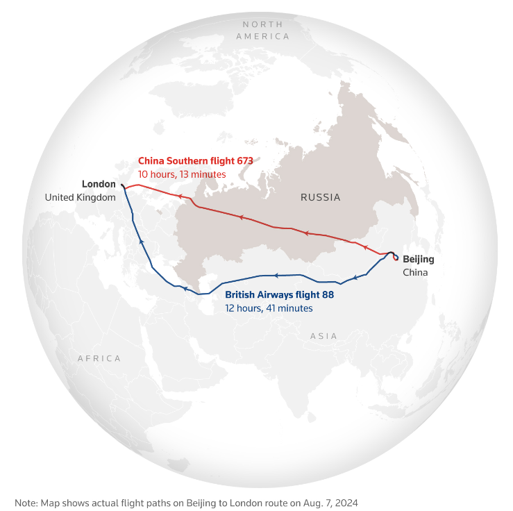 要知道,中国航空公司拥有独特的成本优势:可以飞越俄罗斯领空,选择较短的北部航线飞往欧洲和北美。