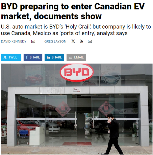 该公司在加拿大销售的启动时间或方式尚不明确,但据一位汽车行业消息人士透露,比亚迪最近已与加拿大经销商会面,讨论建立本地经销网络的问题。目前已获得多伦多交通委员会10辆电动公交车的订单,还有30辆的选择权。比亚迪加拿大副总裁Ted Dowling表示,随着传统汽车制造商撤出加拿大,全国各地的市政当局正加倍努力,通过零排放的交通工具来应对气候变化。比亚迪未立即回应有关其在加拿大潜在推出计划、是否在加拿大制造或如何应对渥太华正在考虑的电动汽车进口关税的多次置评请求。这家公司在2023年底超越特斯拉成为全球电动汽车销量冠军,如果进入加拿大市场,将成为首家在加拿大销售乘用电动汽车的中国主要本土汽车制造商。与此同时,比亚迪已经在墨西哥建立了业务,今年早些时候交付了首批100辆元Plus紧凑型跨界车。7月,比亚迪选择在墨西哥城全球发布了BYD Shark,并计划在墨西哥中部建厂生产插电式混合动力皮卡,该工厂将创造超过1,000个就业岗位。比亚迪还在亚洲、欧洲和南美的多个全球市场运营,但值得注意的是,它并未进入美国市场。美国最近承诺将对中国制造的电动汽车的进口关税从之前的27.5%提高到102.5%。2月,比亚迪执行副总裁兼比亚迪美洲首席执行官李星星(Stella Li)表示,公司“没有计划”进入美国市场。她指出了对中国公司日益增长的政治反对和电动汽车普及速度放缓的原因。与美国类似,欧盟在7月对比亚迪车辆征收了17.4%的临时进口关税,理由是对中国政府支持的电动汽车存在不公平的补贴,特别是对补贴电池材料的准入。加拿大目前正在进行对中国政府支持汽车制造商的审查,这可能导致关税的出台。联邦贸易和财政官员于7月2日开始了为期30天的咨询。美国汽车预测解决方案公司(AutoForecast Solutions)首席执行官乔·麦凯布(Joe McCabe)表示,美国汽车市场是比亚迪的“圣杯”,但该公司可能会利用加拿大和墨西哥作为“进入港口”。“下一步战略是引入乘用车。任何中国品牌汽车制造商进入新市场的目标是发展市场份额,这在短期内比盈利更为重要。”他补充道,关税“只是一个障碍,而不是进入壁垒”。这一举动可能会大幅改变电动汽车领域的格局,同时也将引起联邦政府的审查,因为渥太华的贸易官员正在权衡对从中国进口的电动汽车征收关税的可能性。6年前,比亚迪成功斩获加拿大经济大省魁北克的首批9台纯电动大巴订单,标志着魁北克省正式开启零排放公交时代。从2013年进入加拿大市场至今,比亚迪已先后收获阿尔伯塔省和安大略省的订单,如今伴随着魁北克的加入,本国4个经济最发达的省有3个都选择了比亚迪。2016年3月,阿尔伯塔省圣艾伯特市宣布购买7台比亚迪纯电动大巴,成为加国首个运营纯电动大巴的城市。2017年11月,比亚迪向加拿大最大的食品药品零售商Loblaw交付本国首台16米重型纯电动卡车,标志着加拿大正式进入零排放物流时代。
