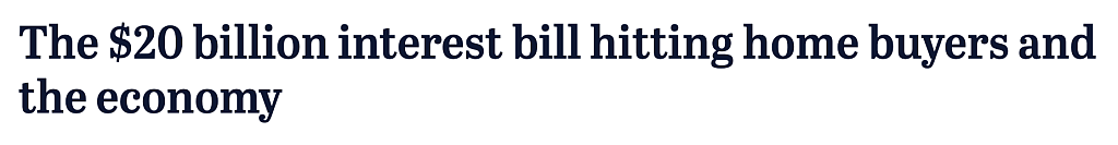 《悉尼晨锋报》8月20日报道,澳洲人用于偿还房贷的费用如今已达总收入的十分之一。仅在过去三个月里,用于支付房贷利息的费用就高达近200亿澳元。与此同时,越来越多迹象表明,高昂的房贷成本正迫使消费者减少开支。