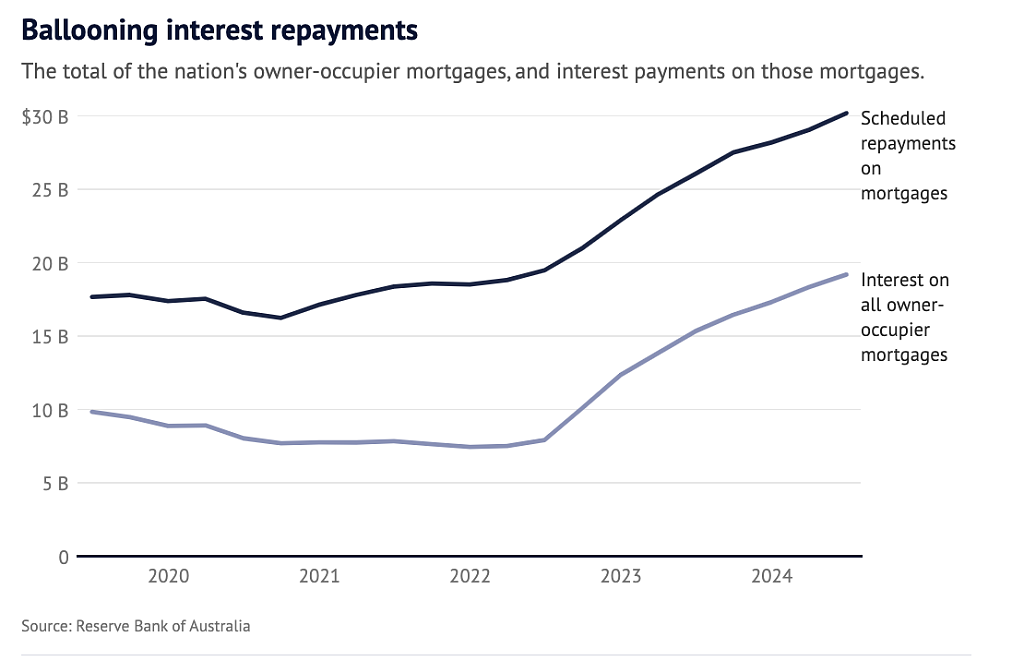 在过去12个月里,利息成本猛增了25%,约为39亿澳元。自2022年初澳联储开始加息以来,借款人承担的利息支出每季度增加了117亿澳元,涨幅达155%。