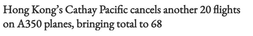 国泰航空随后紧急停飞全部48架各型号的A350客机,检查和维修。