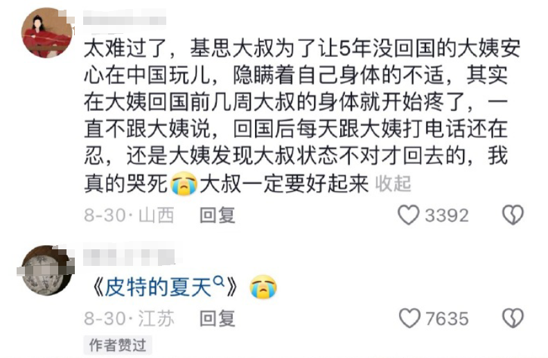 还有人猜测,其实在大姨决定带着Peter回国过暑假前,干巴大叔应该察觉到自己身体不舒服了,可为了让他们度过一个美好的假期,他什么也没说。