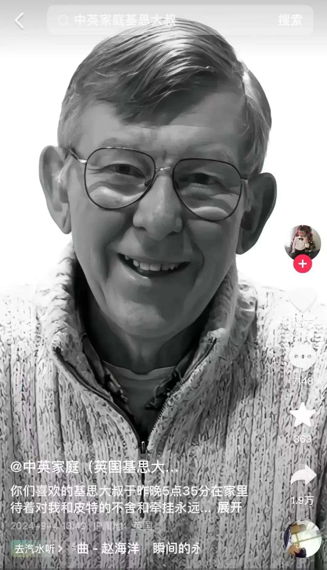 据抖音用户“中英家庭(英国基思大叔和东北大姨)”发布的最新消息,她的丈夫因罹患骨癌,于昨晚5点35分永远离开了人世。