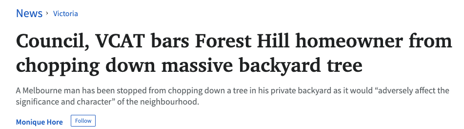 但是,法院却表示,墨尔本各地议会都纷纷加强了对树木的管控,如果未经允许砍伐大树,或将处以2万澳元的罚款。