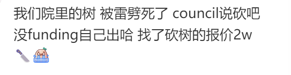 有网友表示:我们院里的树被雷劈死了,council说砍吧,没funding自己出,找了砍树的报价2万刀。
