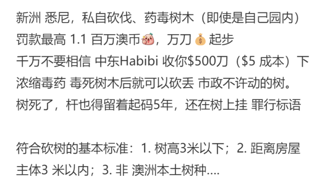 此前,一位华人网友在社媒发文写道:“新州悉尼,私自砍伐、药毒树木(即使是自己园内),罚款很严重。”