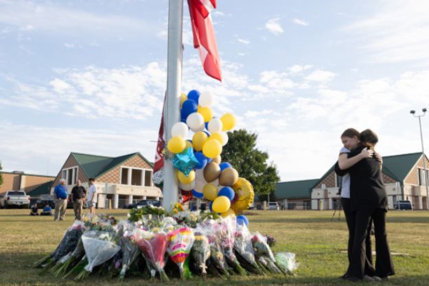 乔州的这所中学周四取消上课,不过有些人仍来到临时纪念碑旁留下鲜花,并低头跪在草地上。