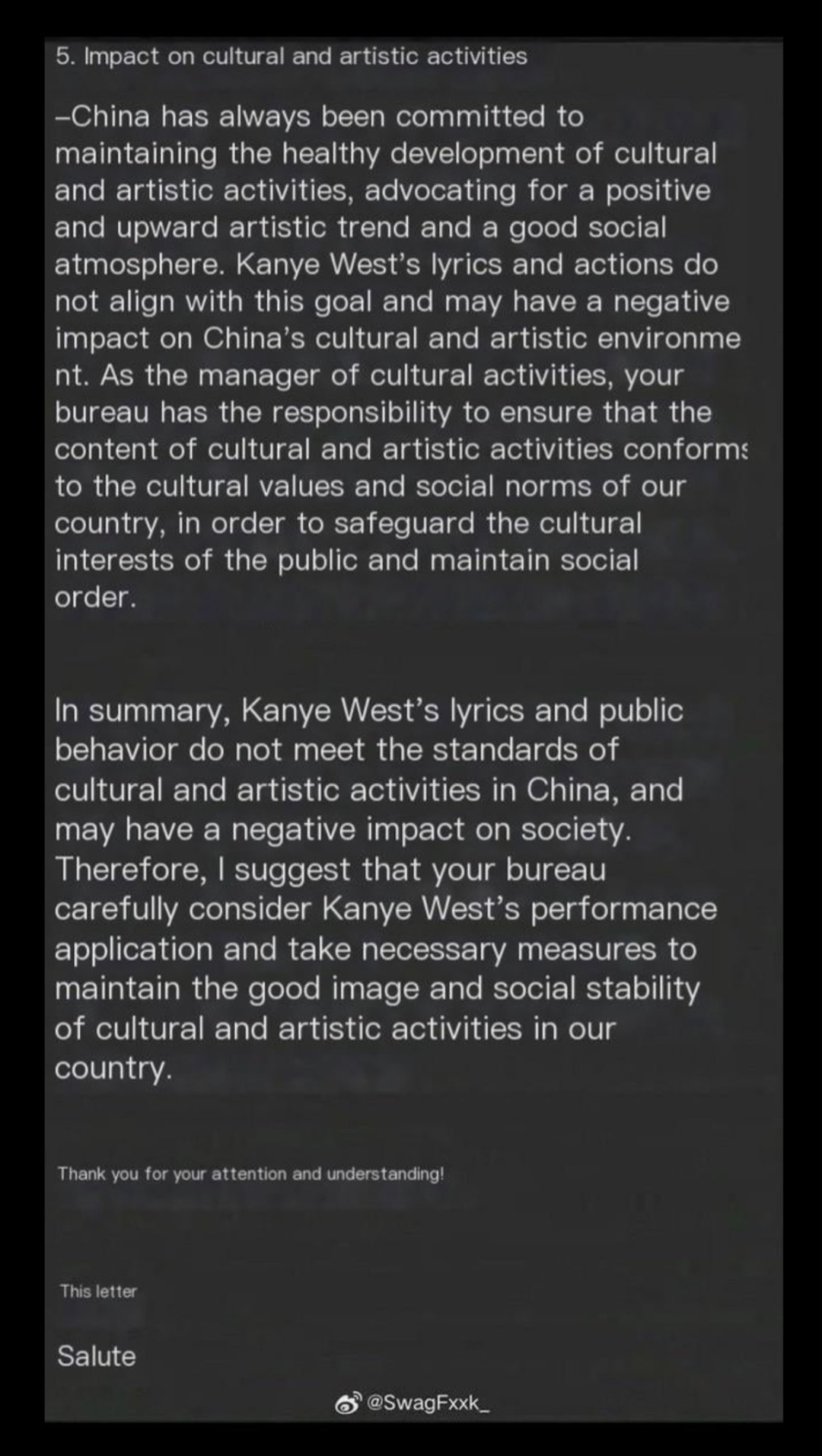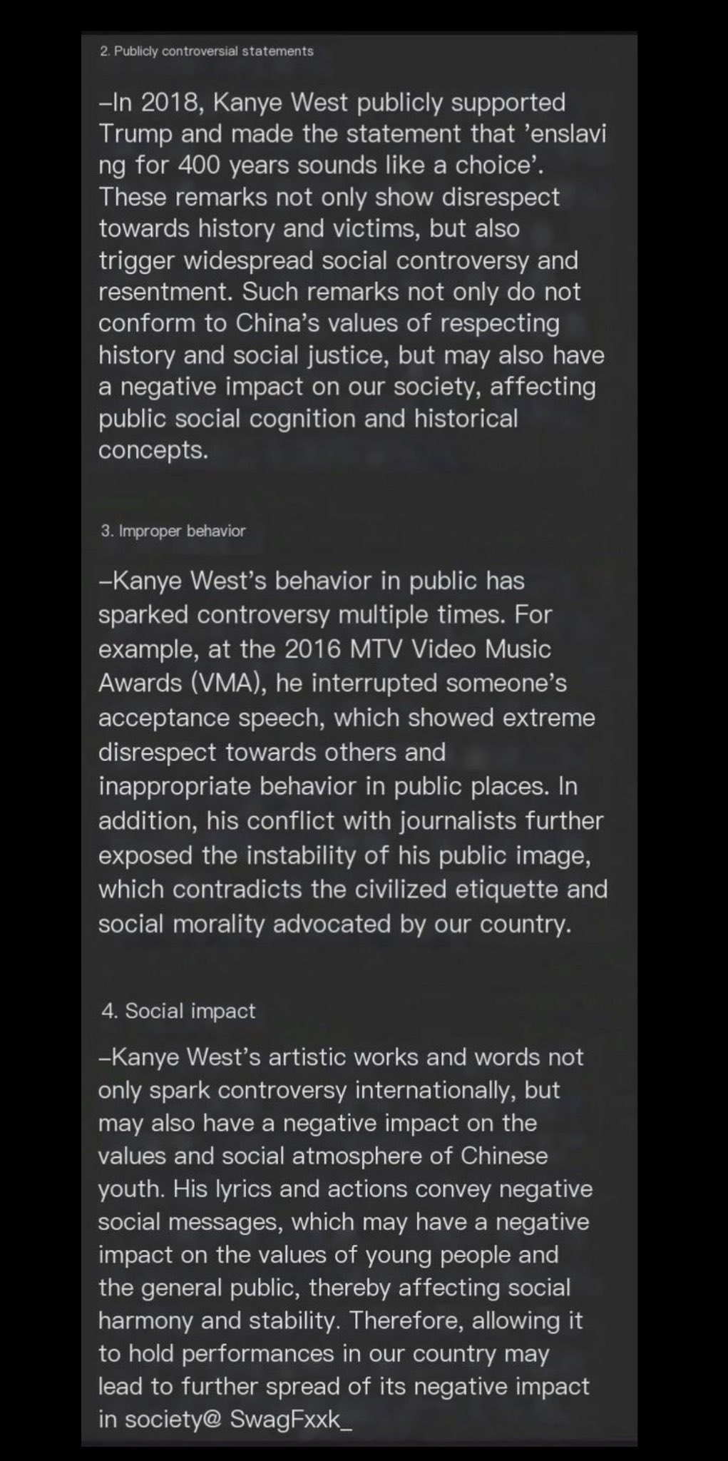 2022年,侃爷发表的一系列反犹太言论,导致他与《Vogue》、环球音乐集团、巴黎世家、Gap和Adidas的合作、赞助和伙伴关系终止
