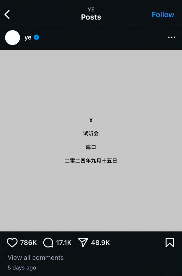 前两天,Outlast Records 首席执行官兼音乐经纪人 Daniel McCartney在 Instagram 上官宣,侃爷(曾用名Kanye West,现在改名Ye,绰号侃爷)将在9月15日(也有媒体报道说是9月7日)在中国海南省海口市举办音乐试听会。