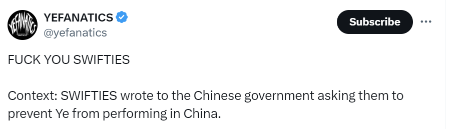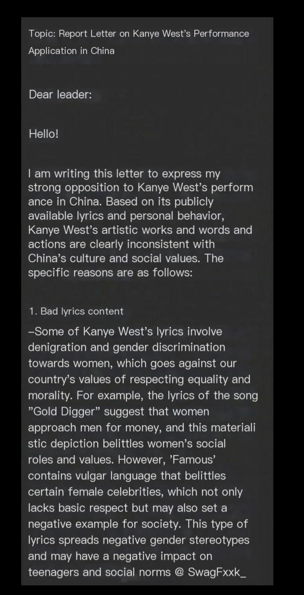 所以这次听说侃爷要来中国开唱,霉霉的粉丝甚至写了一篇小作文,声称要提交给当地ZF,指出侃爷个人行为不端,歌词low爆毫无底线,请求主办单位取消侃爷的演出