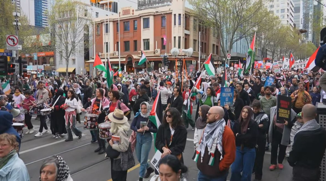 同样是在周日下午,数百名亲巴勒斯坦抗议者沿着Swanston St游行,CBD多条街道封闭。