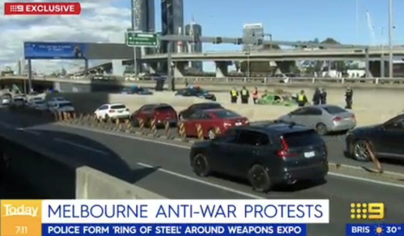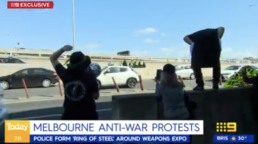 反战抗议者在周六就已经封锁了墨尔本的一条主要干道,呼吁政府关闭这场直到周三才开始的军事武器大会。