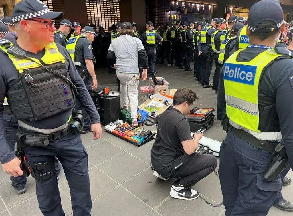 Collins St的电车被迫停运,乘客只能下车,数十名警察在现场维持秩序。