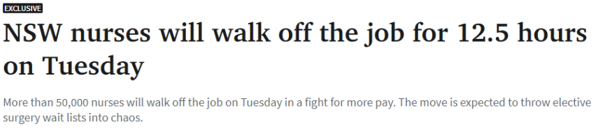 与此同时,悉尼也将在这几天迎来一场规模更为庞大的抗议活动,这次的主角是医疗从业者——超过5万名护士将集体走上街头,对现有的薪资待遇和工作条件表示强烈不满。