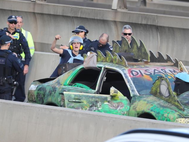 一名活动人士被锁在一辆车上,警察被叫来将她解救出来。经过大约两个小时的骚乱后,她和另一名20多岁的女子被捕。但他们的“激情奋勇”遭到了驾车者的愤怒回应。坦克在夜色中被带进武器博览会。