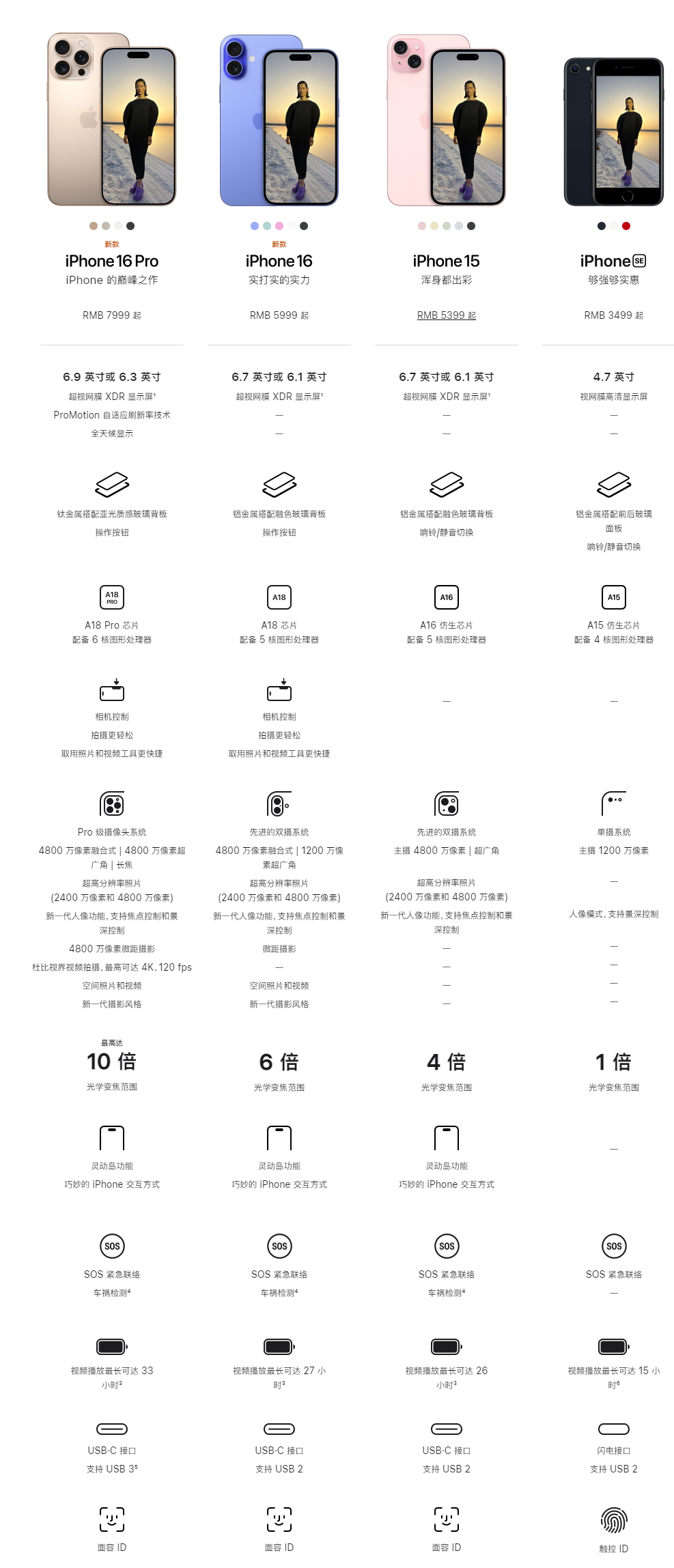 四款新iPhone均配备拍照按钮,用户可以通过前后滑动手指来调整相机。这个按钮可以轻触对焦、再按一下拍照,滑动时能调整焦距等。有外媒此前称其为新一代iPhone的“最大卖点”。在苹果官网上,也用了较大篇幅介绍该拍照按钮。