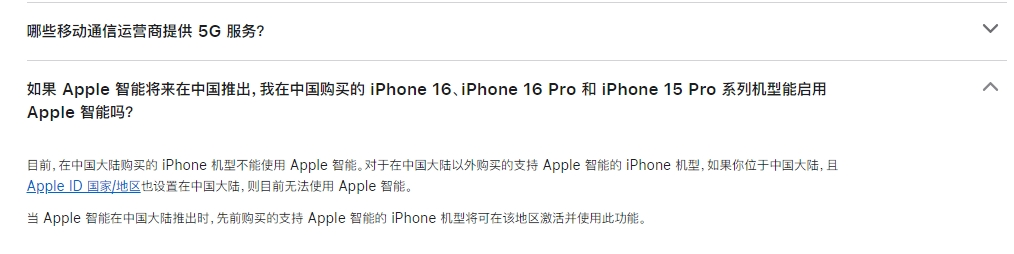 在官方商城上,苹果发布了提示:苹果智能暂不适用于在中国大陆购买的iPhone机型。对于在中国大陆以外购买的支持苹果智能的iPhone机型,如果你位于中国大陆,且Apple ID国家/地区也设置在中国大陆,则目前无法使用苹果智能。当苹果智能在中国大陆推出时,先前购买的支持苹果智能的iPhone机型将可在该地区激活并使用此功能。