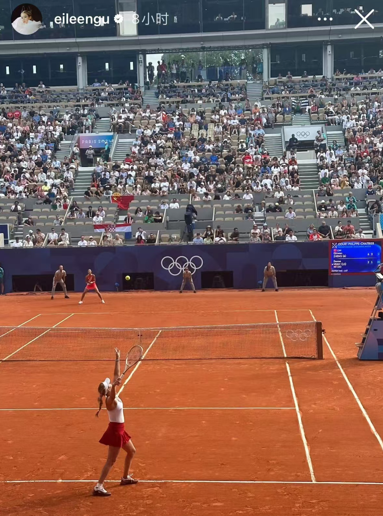 在郑钦文击败维基奇夺得奥运网球女单项目金牌时,谷爱凌就在现场观看,并且在社交媒体晒出了自己观看比赛的动态。