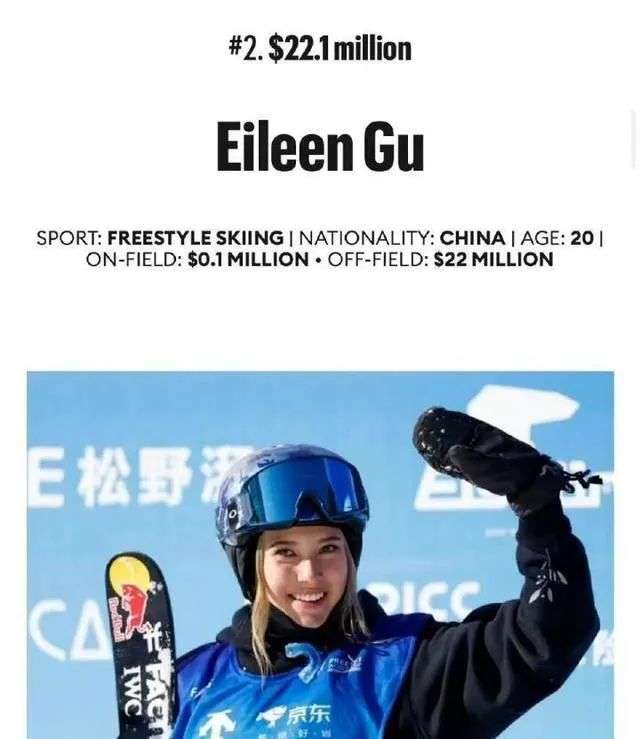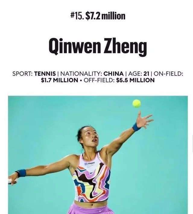 其中谷爱凌位于第2,收入场内+场外总共2210万美元,郑钦文排名第15,总计720万美元收入。