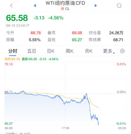 9月10日晚间,国际油价“跳水”大跌。在供应强劲、需求担忧和投机性抛售猖獗的冲击下,油价再度走低。WTI 10月原油期货收跌2.96美元,跌幅4.31%,报65.75美元/桶,创去年5月份以来新低。布伦特11月原油期货收跌2.65美元,跌幅3.69%,报69.19美元/桶,创2021年12月以来新低。
