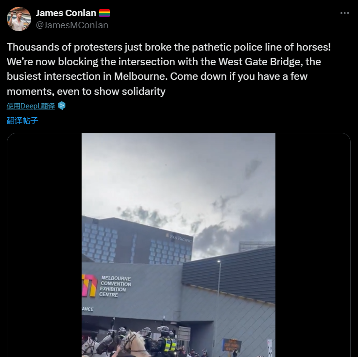 数千名反战抗议者封锁了墨尔本最繁忙十字路口West Gate Bridge,包括骑警在内的 1,800 多名警察正在努力的遏制他们。