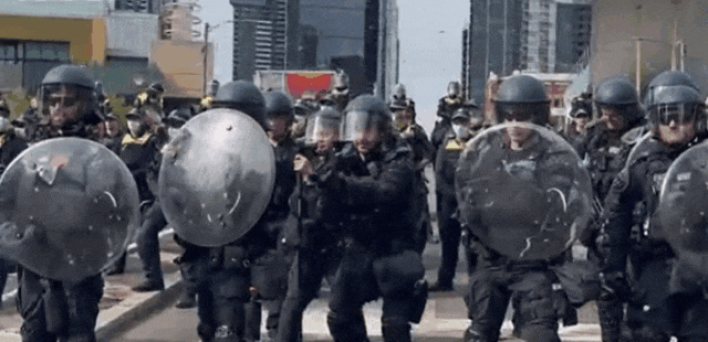 但防暴警察随后向前推进,一名警官用盾牌向后猛击一名示威者,然后用喷雾覆盖他。