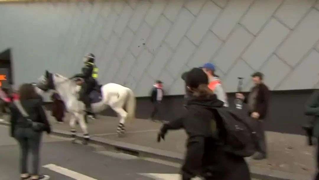还有抗议者将一匹警马团团包围,其中一人抓住了警马的缰绳,一名警官坐在警马身上,看上去十分无奈。幸亏这些马匹都受过专业训练,不然要是真被踢上一脚……只能说这些人真的“很勇”。警察向人群喷射胡椒喷雾,发射橡皮子弹,试图重新控制局面。据称,有现场记者的眼睛被胡椒喷雾喷瞎,数十名抗议者受伤。至少有33人因各种罪名被捕,