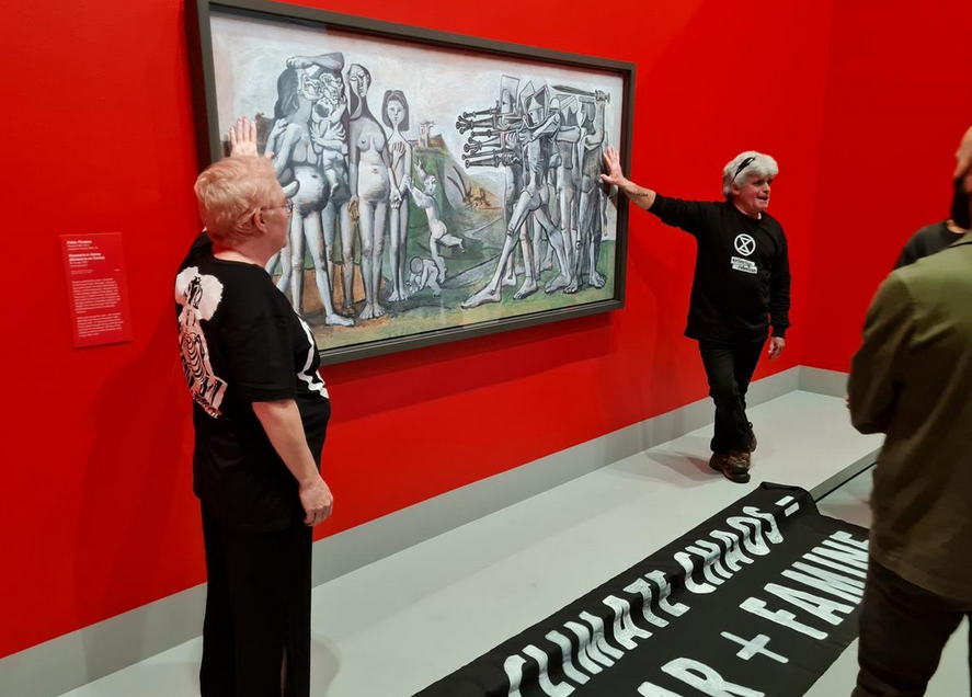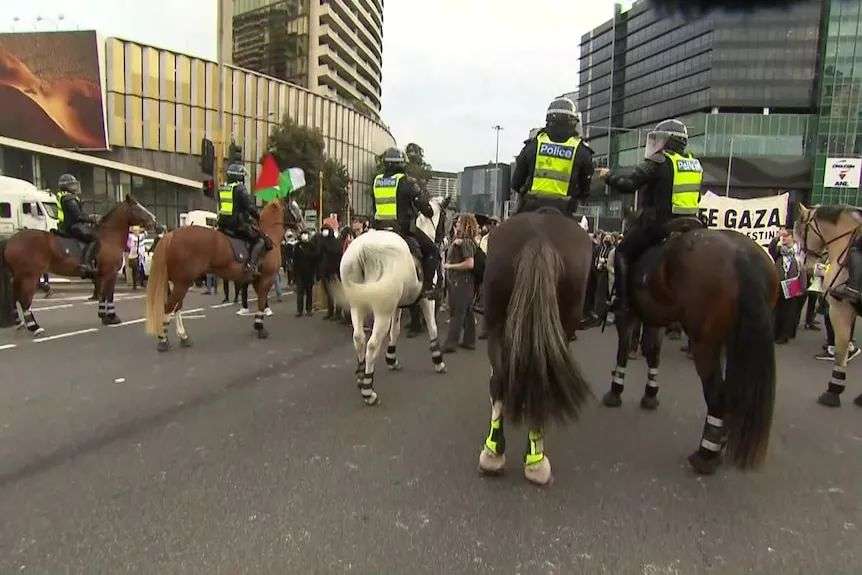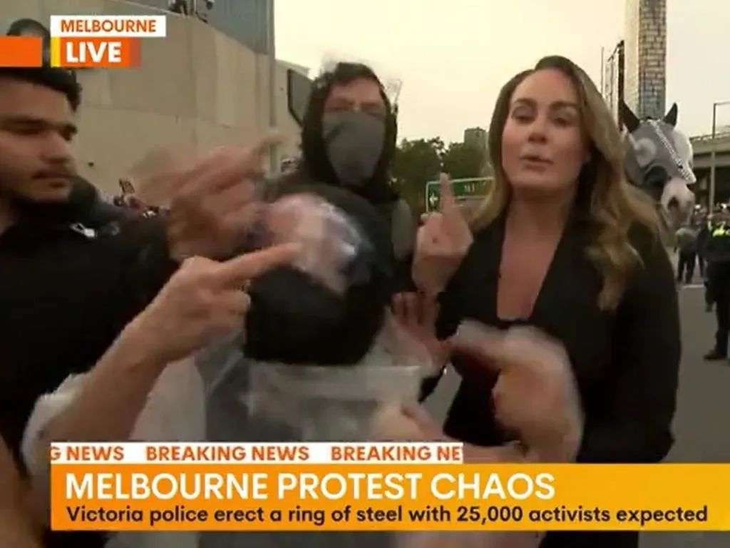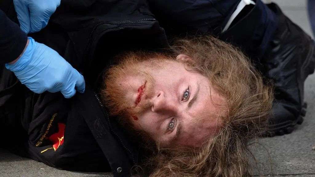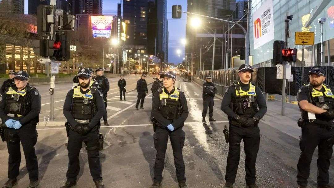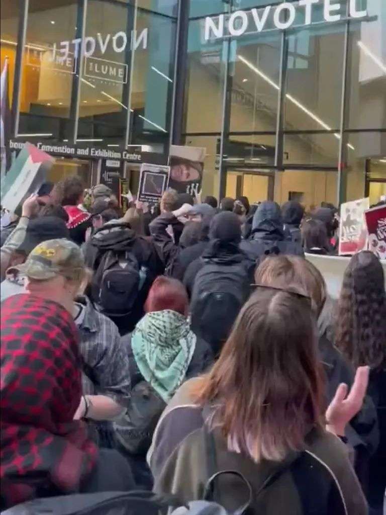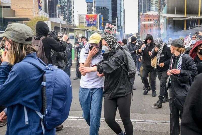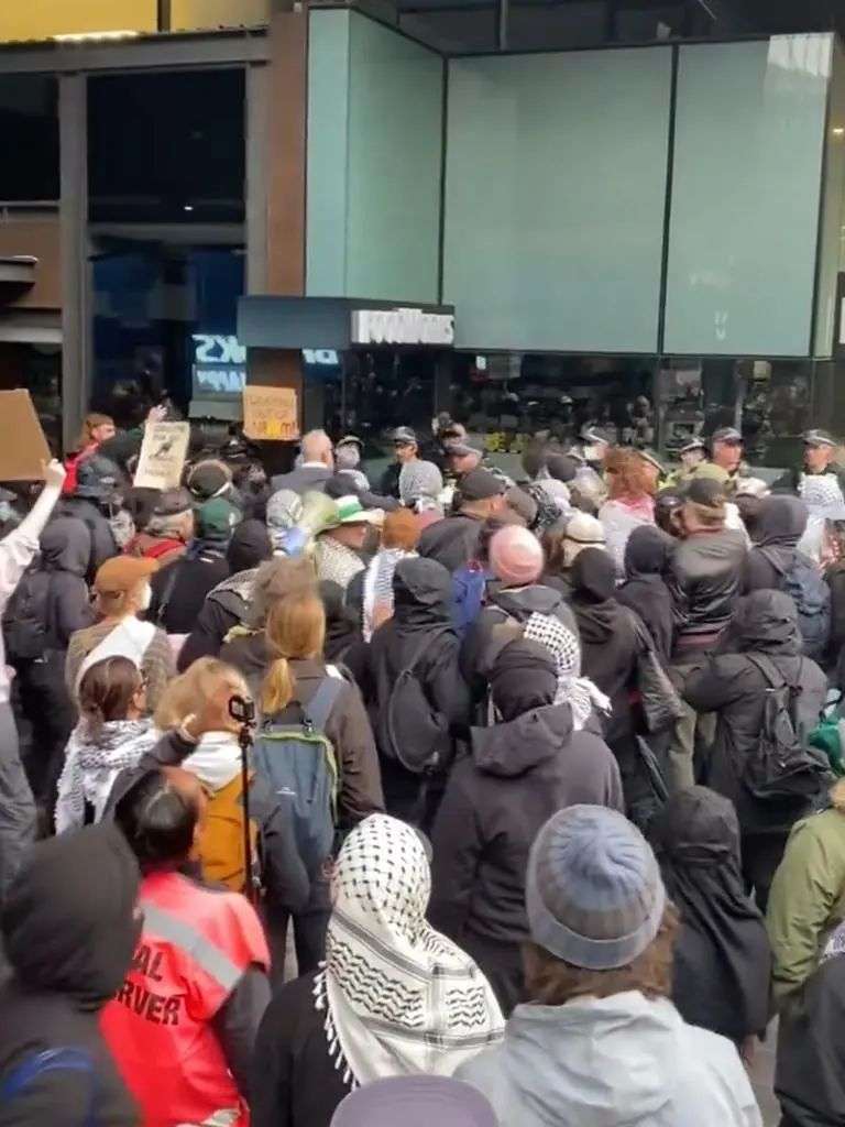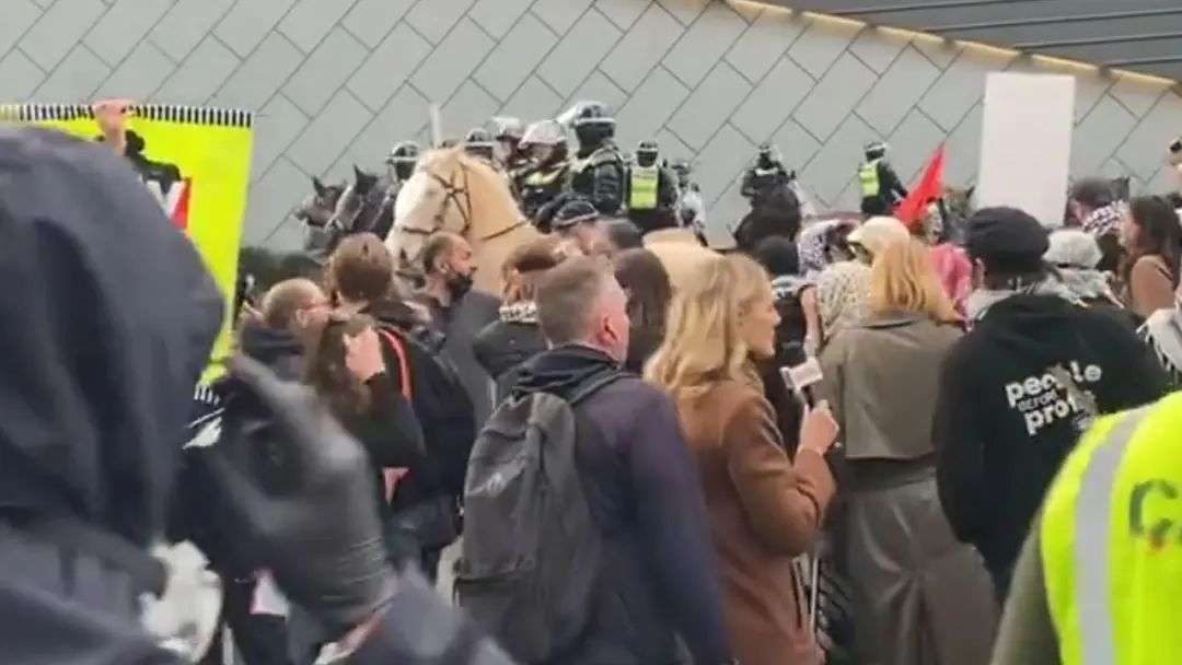 9 News的记者Christine Ahearn在现场进行报道时也被抗议者包围,麦克风险些被抢走,一大群人还拼命地朝着摄像头竖中指……Christine Ahearn表示,抗议者包括亲巴勒斯坦团体和Extinction Rebellion活动团体,他们与警方发生了“激烈冲突”。前者不必多说,在澳洲“挺巴”的从来都不少,前段时间还在校园里安营扎寨;后者则是臭名昭著的活动组织,在世界各地都有活动,曾经制造过给纽约铜牛泼假血,使伦敦地铁瘫痪,以及将在柏林大街上“躺尸”抗议等闹剧。2022年10月,在墨尔本的维多利亚国家美术馆,还有该组织成员将手粘在毕加索的名画《朝鲜大屠杀》上,引起一片混乱。
