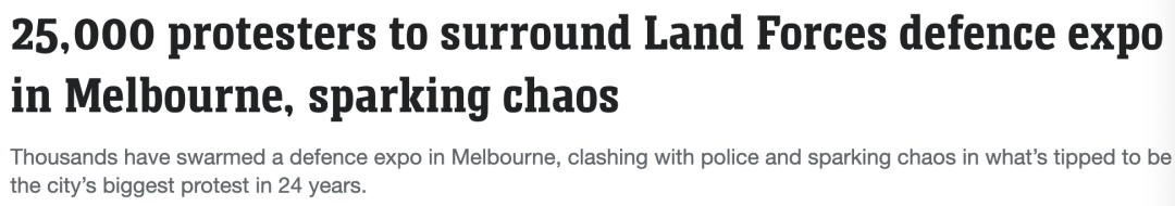 据报道,由于反对在墨尔本会展中心(MCEC)举行的陆军军事武器博览会,数万人聚集在会展中心周围,举行抗议示威活动。该展会原定于9月11日至13日举行,澳洲陆军、国防、政府和学术界将与来自31个国家的995个参展组织一起参展。但有多个环保和反战组织表示不满,一些支持巴勒斯坦的人们也到场抗议。