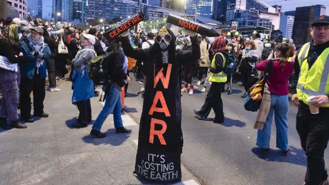 许多澳人也对他们颇为痛恨,但这个组织的人,似乎越来越多了……而且,抗议者的口号也很明确:把这么多武器抬进墨尔本的CBD,这是在助长战争风险啊!他们要求澳大利亚政府停止为这些“战争机器”提供资金。反战人士,尤其是那些关注巴以、俄乌局势的人,很容易就加入了他们的示威游行之中,但他们内部也不团结。据称,有人高高挥舞着巴勒斯坦国旗,结果立马就被人抢走了。
