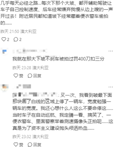 又一次、我看到破最下面那块画了白线的区域上停了一辆车,宽度勉强一辆车的宽度。我还心想什么人这么不要命停这……当时车子在自动巡航、我定睛一看、搞笑了、一便衣警车、里面警察举着测速摄像头正拍呢……这真是为了资本主义建设抛头颅洒热血……