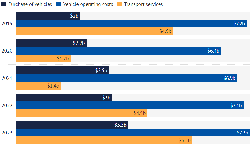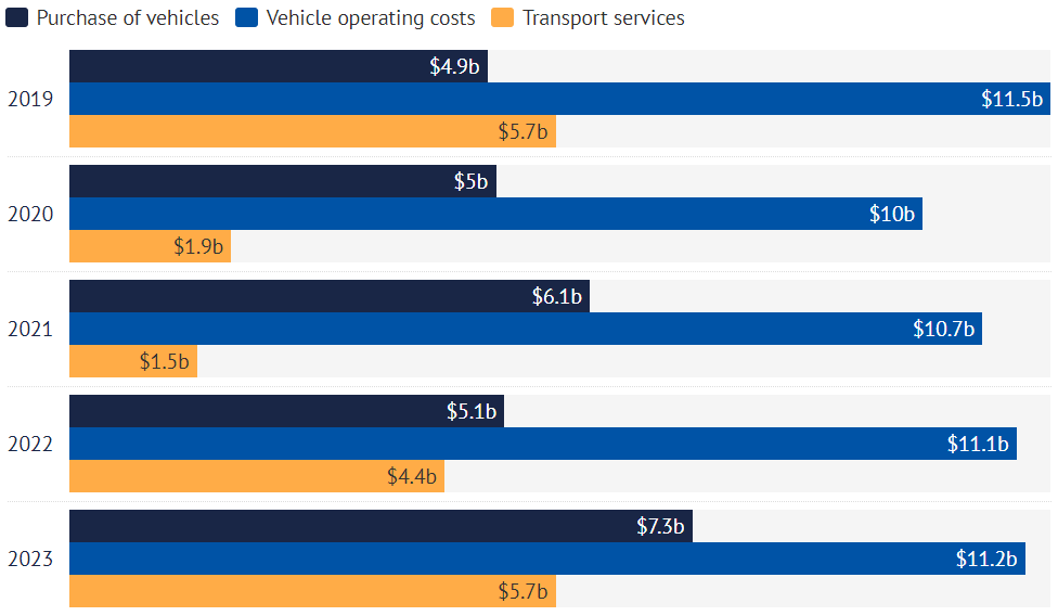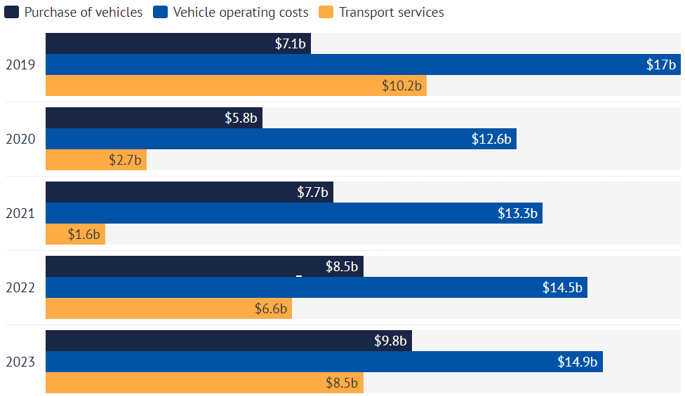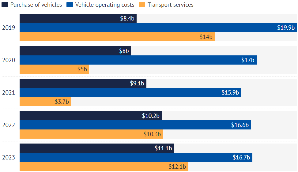 维州家庭在汽车运营上的支出在2019年达到170亿澳元的峰值。2023-24年,尽管该州新增了31万居民,但在汽车上的支出仍仅能维持在150亿澳元。