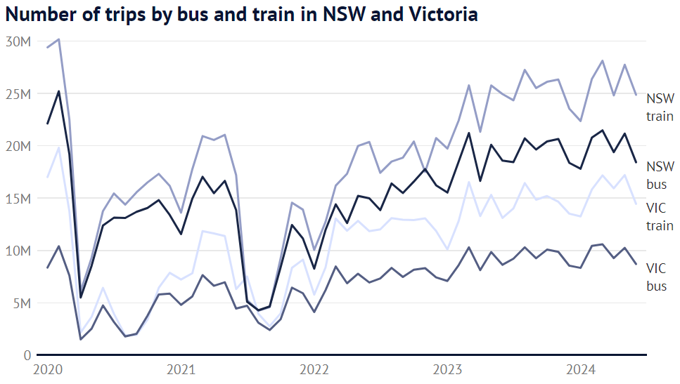 维州的火车乘客量也比疫情前的水平每月下降了约500万人次。这两个州的巴士网络也出现了类似的下降。