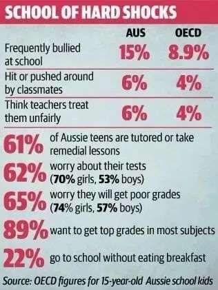 根据经合组织的平均水平,67%的澳洲学生报告说,即使为考试做了充分准备,也会感到非常焦虑,而国际平均水平为56%(女孩为64%,男孩为47%)。