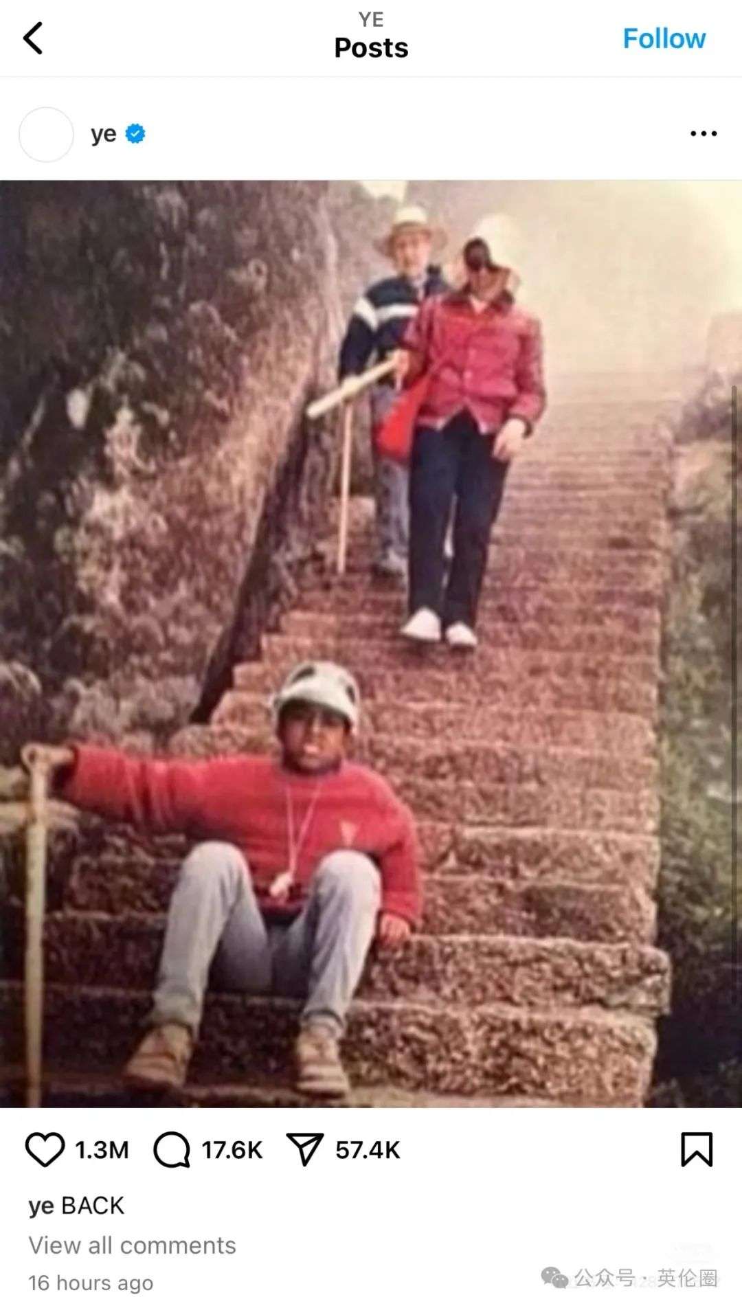 在其中的一条贴文中,侃爷还放出了小时候在中国爬山的童年旧照,并配文称:“回来了!”