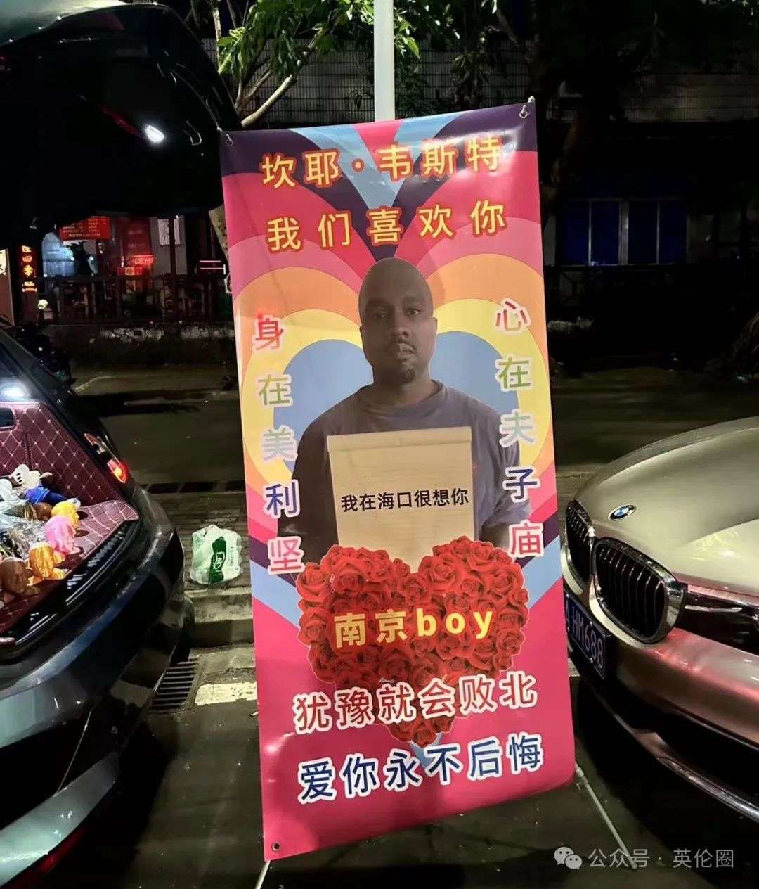 9月13日,侃爷抵达海口美兰机场,热情的粉丝们在路边打出各种富有中国特色的应援口号,迎接这位音乐巨星: