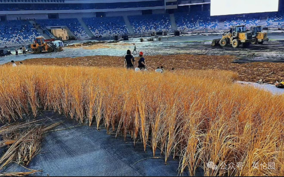 偌大的场馆上铺满了麦子,宛如一片一望无际的乡间麦田,浓浓的丰收之感,非常契合中秋时节: