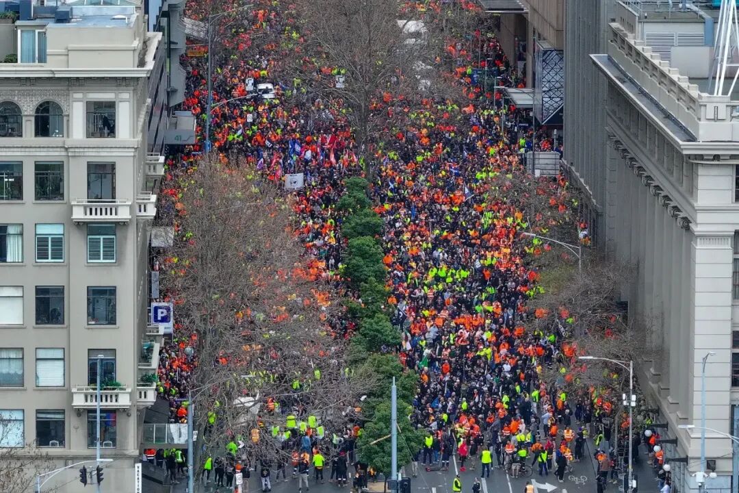 今日在墨尔本的抗议规模更大,据报道超过8.5万工人参与,他们于上午11点开始在CBD集结。