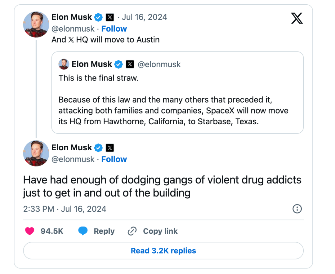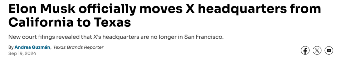 马斯克结束了X作为加州公司的时代,社交媒体平台X(原推特)正式来到德州。
