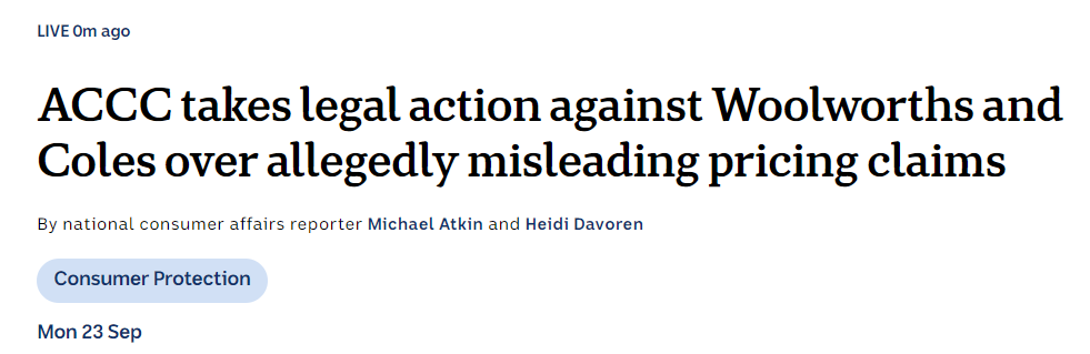 就在9月23日,澳洲公平公正消费委员会ACCC对Coles和Woolworths公开发起诉讼,要对两大超市进行重罚。