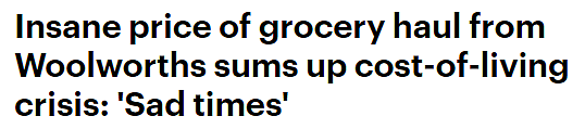 另一位网友留言道:“前几天我跟家人说过这个情况,一辆小购物车就让我花了300澳币,而在几年前的新冠疫情之前,装满一辆大的购物车只需要200到250澳币。”