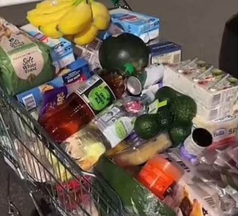 男子一边展示他的购物车一边说道:“这还是较小的那种购物车,我买了一些培根,还有一罐婴儿配方奶粉——那就要30澳元,还有几包香肠。这些东西花了我近400澳币。”