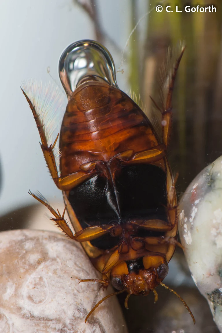 有些水生昆虫(例如潜水甲虫)潜水时也会携带一个气泡。气泡可以为它们的潜水提供短暂的氧气供应,不仅如此,气泡还充当了“物理鳃”的作用,当气泡内的氧气浓度降低时,气泡还可以收集周围水中溶解的氧气。不过,和潜水钟蜘蛛的情况类似,随着气泡内的氮气慢慢扩散到水中,气泡会慢慢变小,它们必须重回水面“补气”。