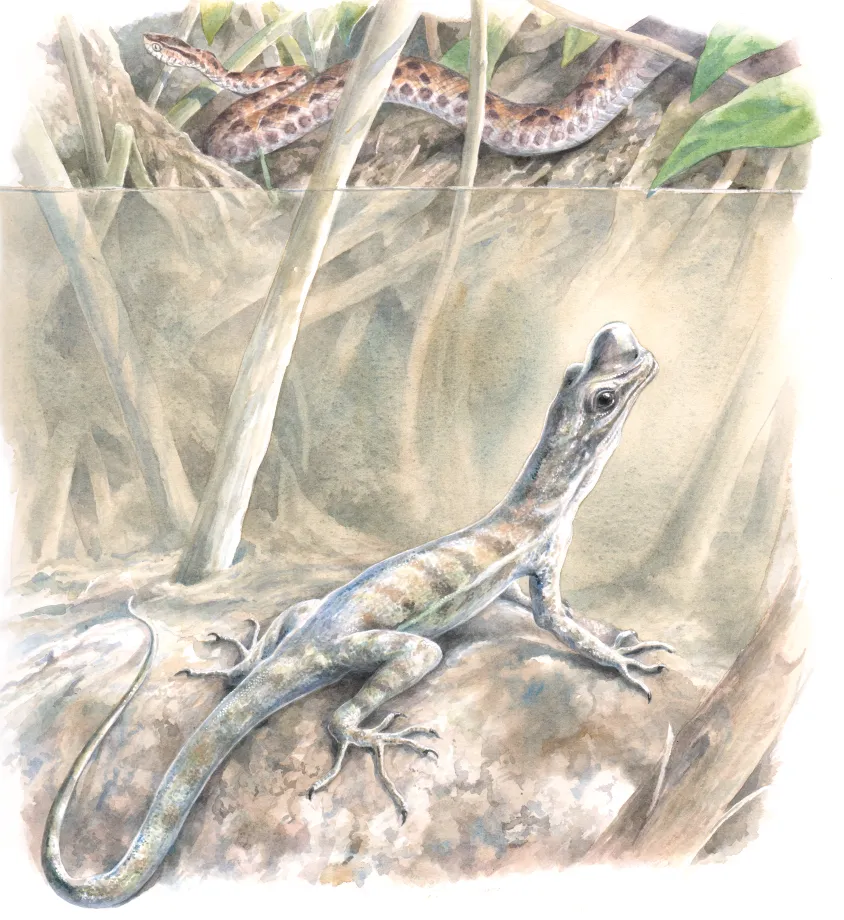 不过,跳入水中并在水下保持静止,确实能够帮助水蜥蜴躲避许多捕食者。“至少对于像我们这些研究人员这样的人类追捕者来说,潜水是迄今为止最有效的逃脱方式,” 斯维克说道。“一旦潜入水下,透过流动的水面就很难发现它们。”