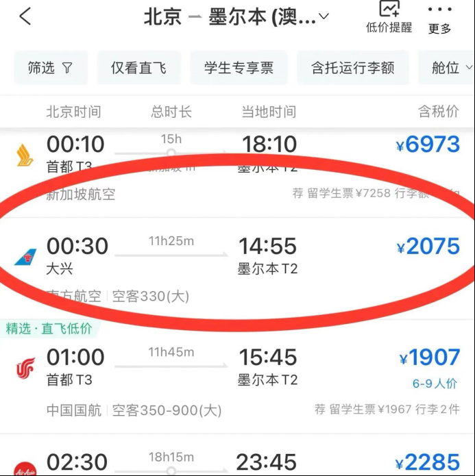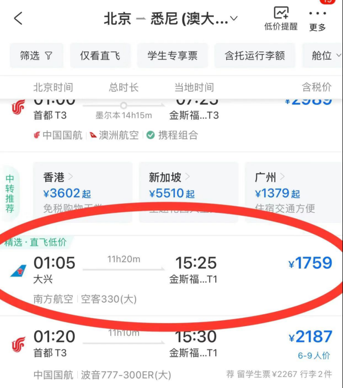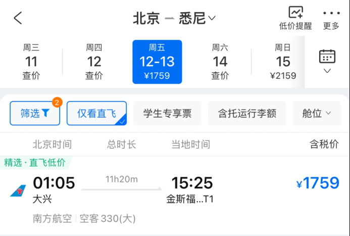 如果避开高峰期,或者说提前购买,价格会更加便宜,刚刚提到的最新开通的大兴往返悉尼的航线,现在购买也只需要1759元人民币。