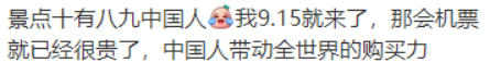 “景点十有八九中国人我9.15就来了,那会机票就已经很贵了,中国人带动全世界的购买力”